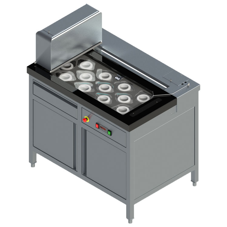 Die Messplätze sind in einer rechteckigen Wanne (4/4/4) angeordnet, welche in einem Edelstahlarbeitstisch integriert ist.
