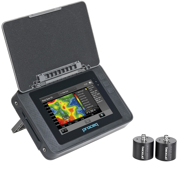 According to EN 12504-4, ASTM C597-02, BS 1881. Ultrasonic pulse velocity (UPV) test instrument to examine the quality of concrete and other materials such as rock, wood and ceramics. It provides an extended range of measurement modes and superior features for measuring on-site testing: Assess the concrete uniformity using standard A-Scans and the new Line Scan functionality, estimate the compressive strength of concrete or measure the surface velocity and the depth of perpendicular cracks. The intelligent software supports directly accessible settings in real time from the measuring screen.