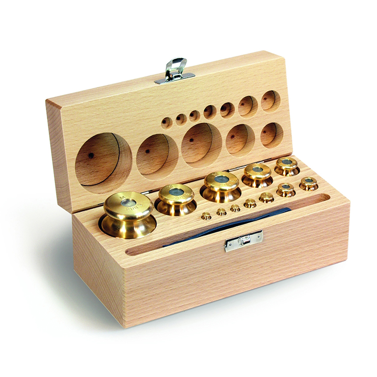 Zestaw wzorców masy w drewnianej skrzynce, zawartość 2000 g