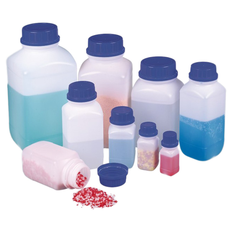 Przezroczysta, kwadratowa z zakrętką.